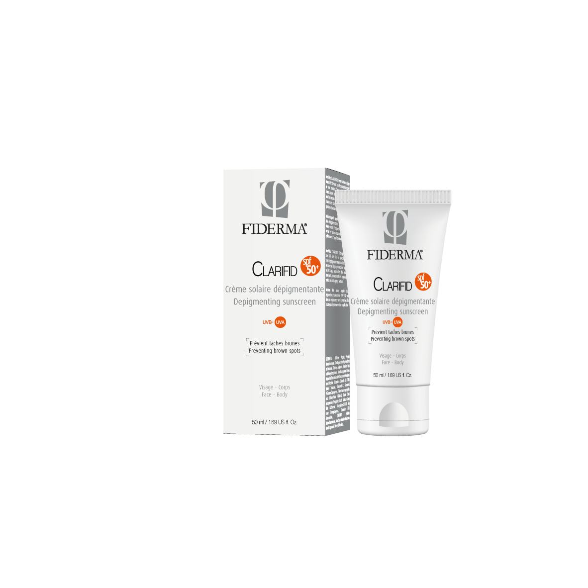 Properties: CLARIFID Depigmenting sunscreen SPF 50+ is a specific sunscreen to treat hyperpigmentation. Its formula ensures a very high protection against UVA and UVB rays, promotes the reduction of brown spots, prevents their appearance and provides an anti aging action.